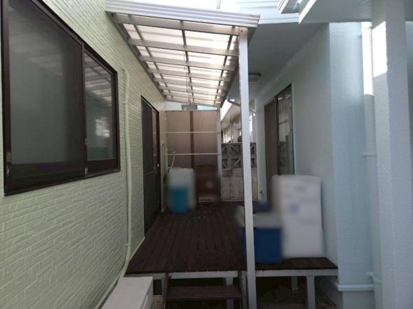 施工前のサンデッキは、外からの視線が入りやすく、猫ちゃんが母屋と離れを行き来する際に飛び出しの不安がありました。