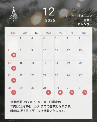 ガイソー沖縄中央店より、今月の営業日についてお知らせです。